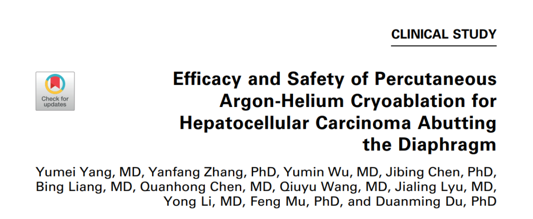 背景:由于一些原因,位于膈肌附近的腫瘤的熱消融在技術(shù)上具有挑戰(zhàn)性。首先,術(shù)中計(jì)算機(jī)掃描和超聲檢查無法清晰顯示射頻消融/微波消融切緣。第二,消融過程中不利的針分布和過熱可能導(dǎo)致肝包膜破裂,并對膈、肺和心臟造成嚴(yán)重?fù)p傷。第三,即使使用人工腹水,仍有9~22%的患者因肝周粘連或腫瘤位置靠近肝表面而導(dǎo)致膈肌熱損傷。冷凍消融可能是毗鄰膈肌的HCC的一種有前途的治療方法,因?yàn)樵谙谶^程中使用CT和US可以很好地顯示腫瘤邊緣。盡管一些研究評估了在高危區(qū)域使用冷凍消融治療HCC,但很少有研究針對膈肌臨近區(qū)域。